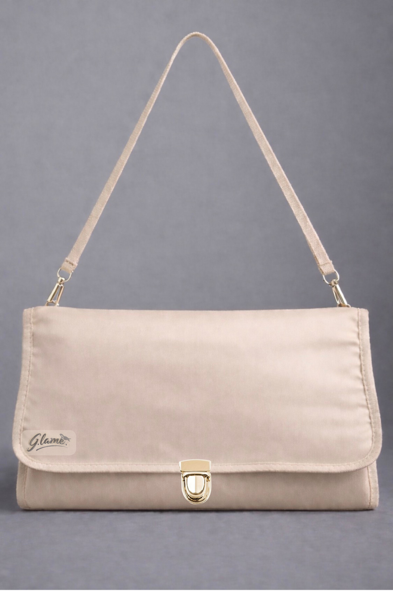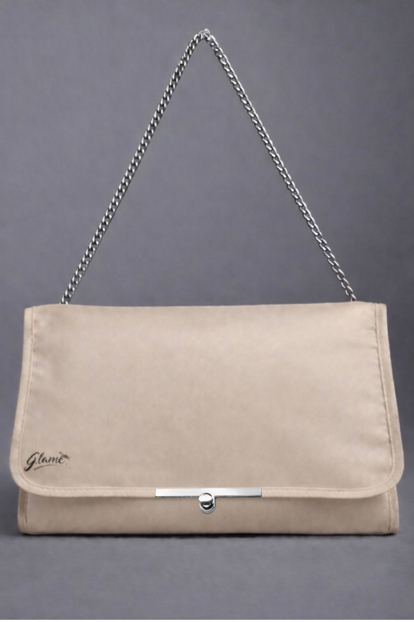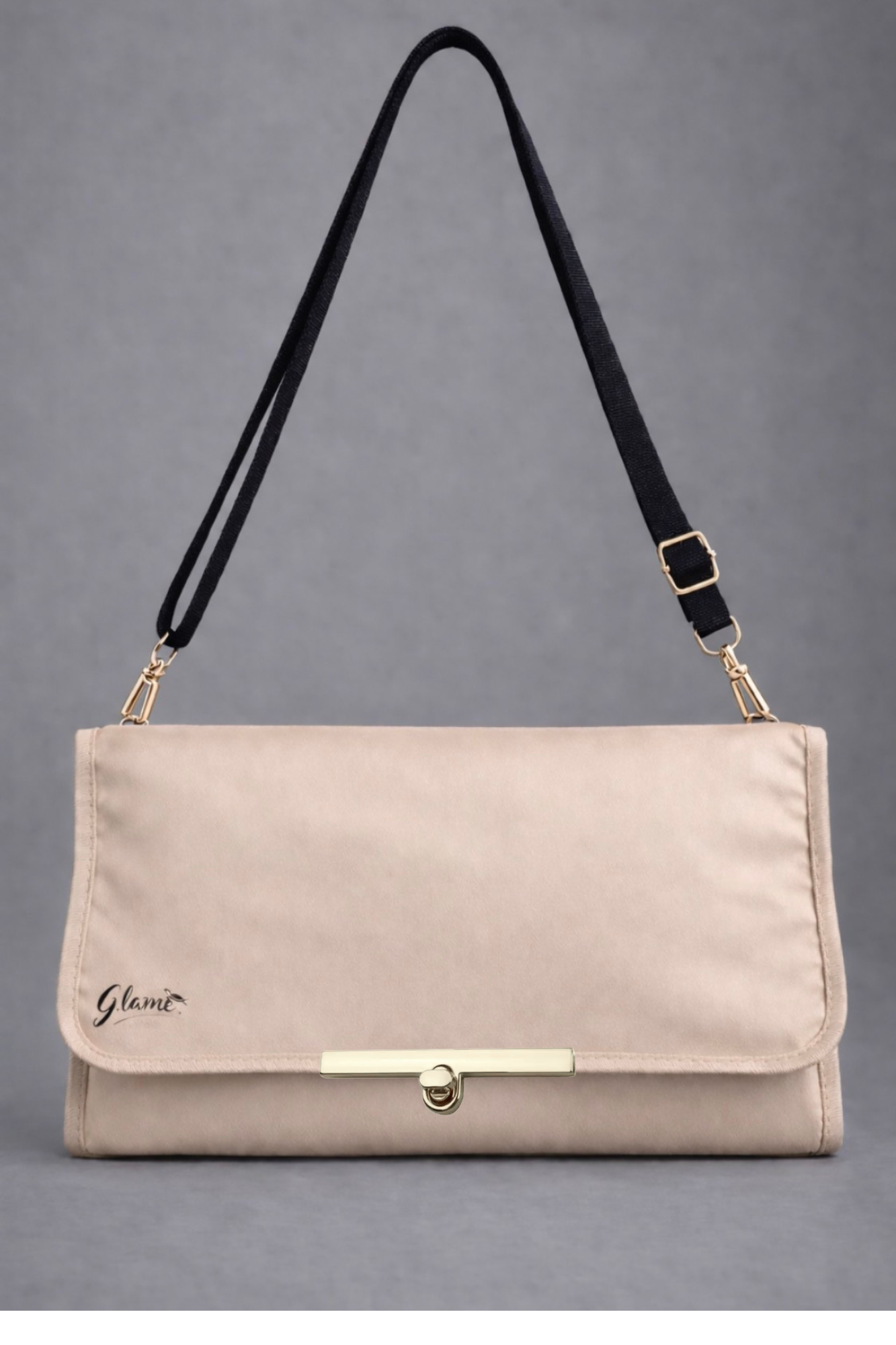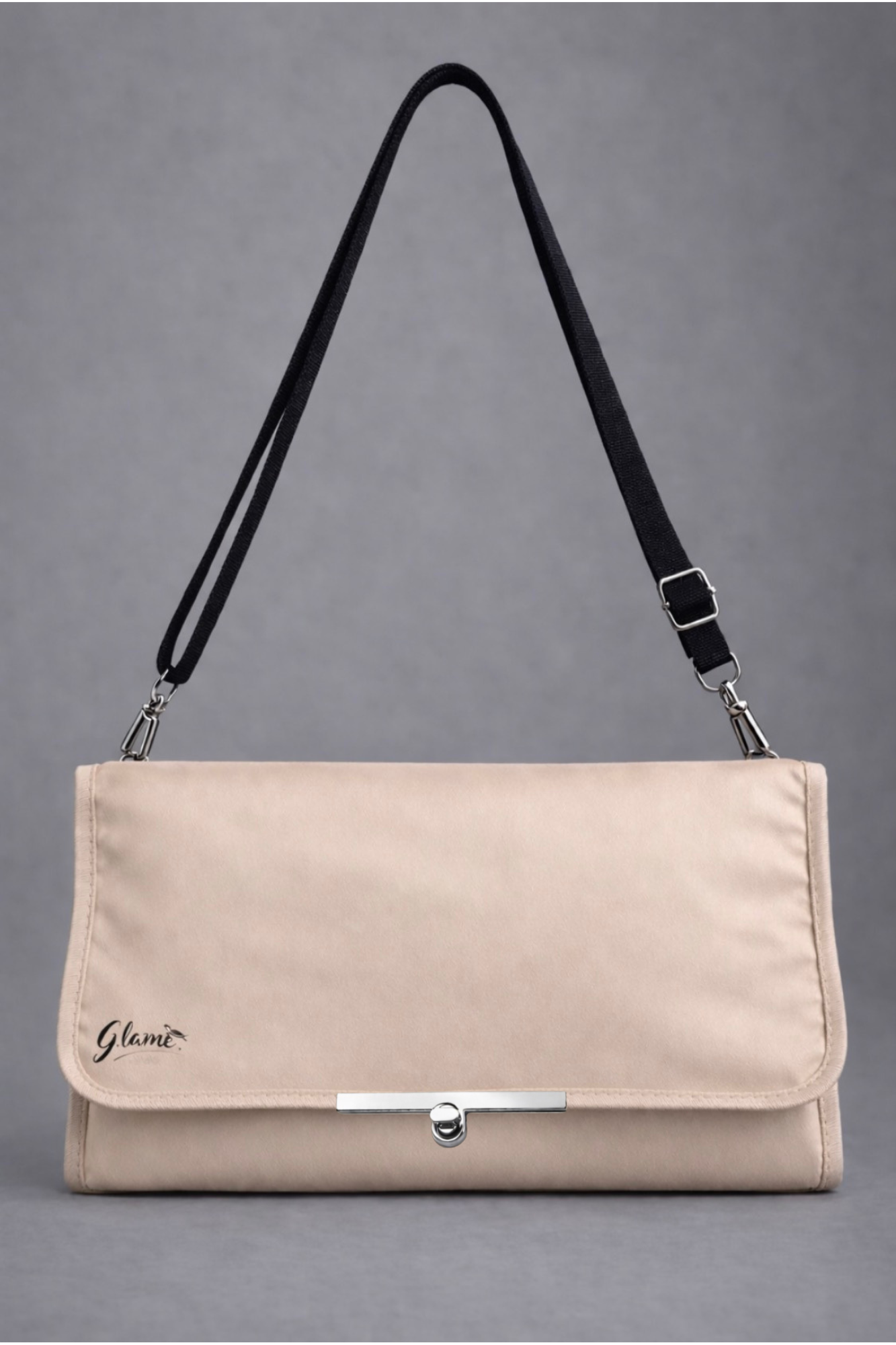 Pochette à 2 compartiments confectionnée en tissu nylon beige, idéal pour ranger, transporter jusqu'à deux justaucorps.